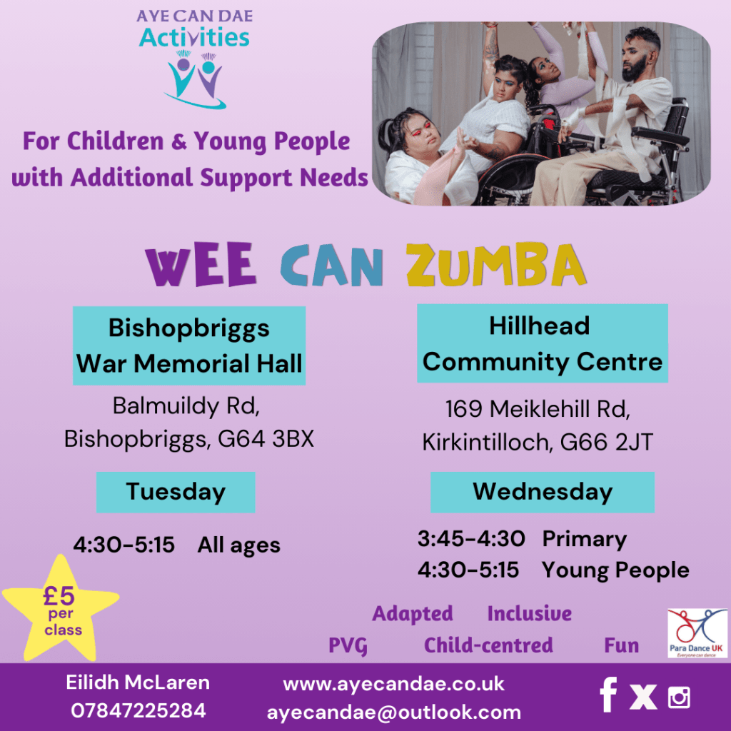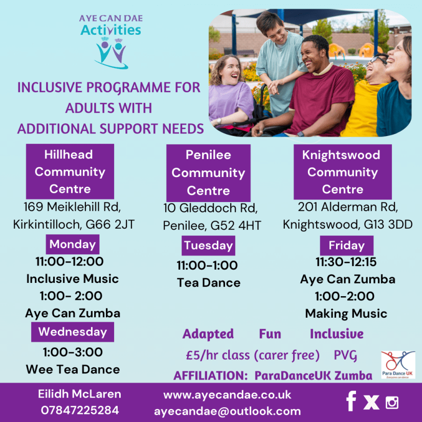 Aye Can Dae Activities has been providing activities in community centres since 2019 (and online during the lockdowns). The latest addition to the programme has been AYE CAN ZUMBA, introducing ACDA members to adapted and inclusive Zumba, and has been a huge success, including Wee Can Zumba for children and Young People.
